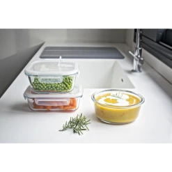 La boîte hermétique ronde (620ml) pourra contenir le goûter des enfants, la boîte conservation rectangulaire (650ml) sera parfaite pour transporter et réchauffer votre déjeuner au bureau telle une lunch box, la boîte en verre carrée (800ml) contiendra un petit gratin ou les restes de votre diner un peu trop copieux. Empilables et transparentes, les boîtes de conservation n’auront pas de secret pour vous puisque vous verrez d’un coup d’œil ce qu’elles contiennent, qu’elles soient dans le frigo ou sur une étagère.
