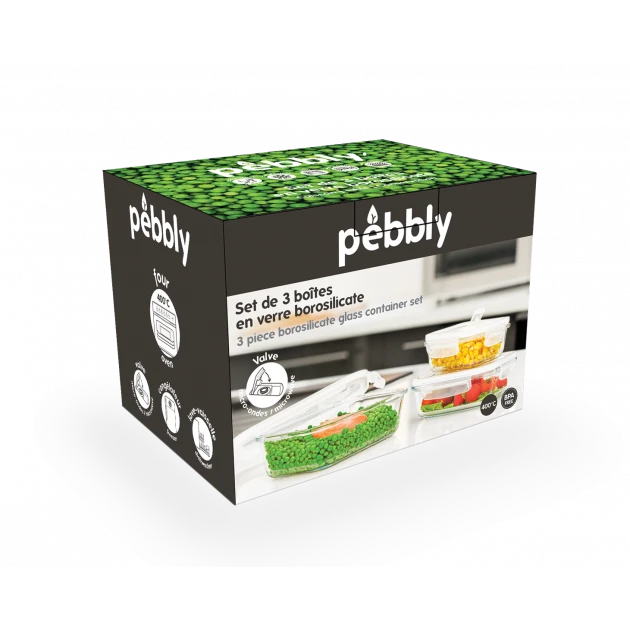 Conçues pour une utilisation intense et quotidienne, les boîtes alimentaires Pebbly possèdent un récipient en verre borosilicate et un couvercle en plastique sans BPA, équipé d’un joint en silicone amovible, d’une valve vapeur pour l’utilisation au micro-ondes et de 4 clapets latéraux pour garantir l’étanchéité. Chaque boîte hermétique pourra être utilisée au four (sans couvercle), au micro-ondes (clapet ouvert), au réfrigérateur, au congélateur et au lave-vaisselle (seulement la partie en verre) pour un entretien facile.